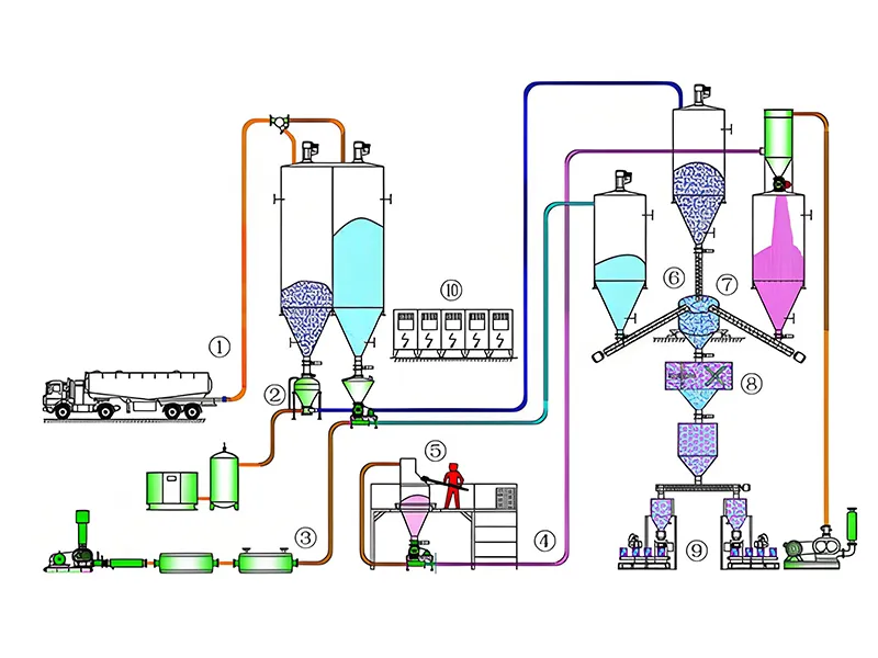 Пневматическая транспортировка – метод перемещения сыпучих материалов, таких как порошки и гранулы, от одного или нескольких точек подачи к заданным точкам назначения. Материал перемещается по герметичным трубопроводам под действием сжатого воздуха или механической энергии. Для автоматизации производства и обеспечения чистой обработки материала возможна интеграция таких этапов, как взвешивание и дозирование, смешивание или сепарация, растаривание мешков, загрузка и разгрузка материала и пылеулавливание.